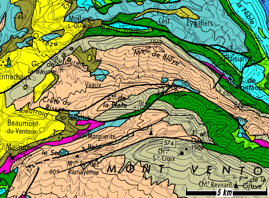 couleurs comme sur la carte ci-après (sauf pour le Barrémo-Bédoulien à faciés provençal du Ventoux et de Bluye).