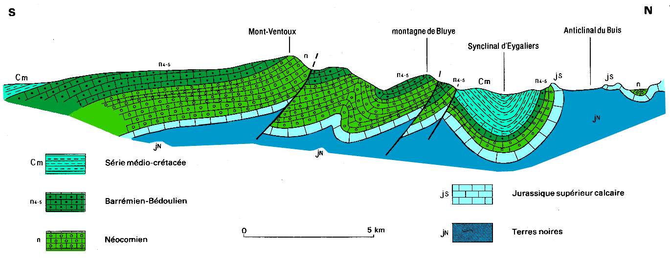 Noter le changement d'épaisseur du Crétacé inférieur ("n" + "n4-5") entre les faciès du rebord provençal (Ventoux) et ceux subalpins des Baronnies (synclinal d'Eygaliers).