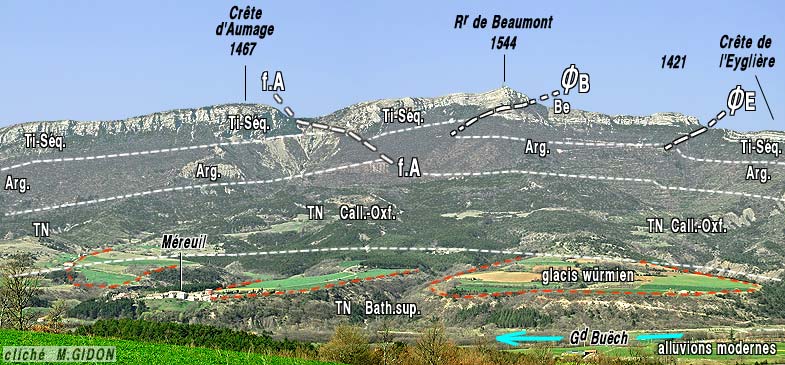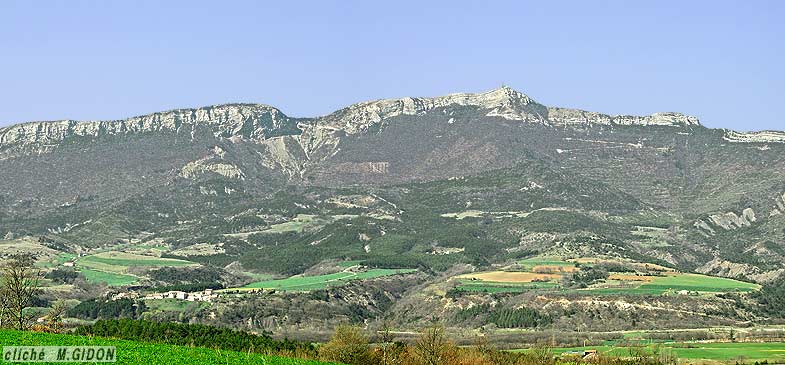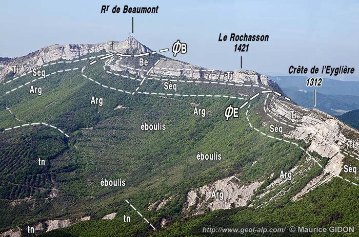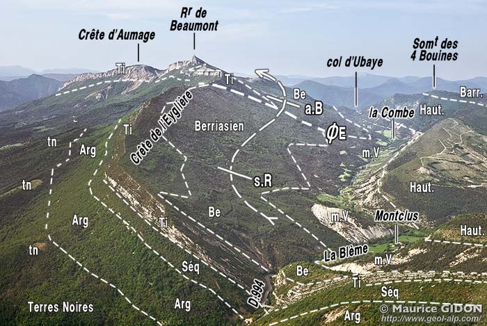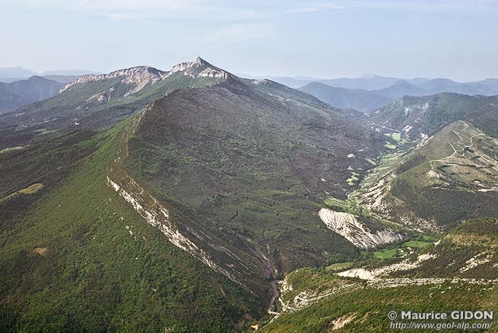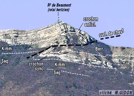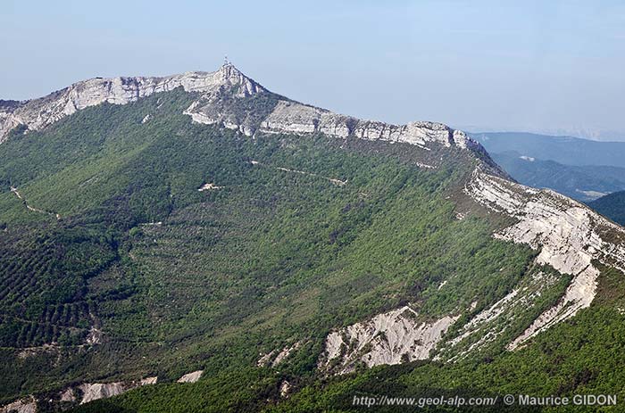 Le sommet de la montagne se situe à la voûte même d'un anticlinal du Beaumont dont l'axe E-W plonge nettement vers l'ouest, ce que montre bien une vue perpendiculaire à son axe (ci-dessus) mais n'apparaît guère sur la coupe qu'en donne la vallée du Buëch (ci-après), qui montre en revanche que ce pli est très ouvert.