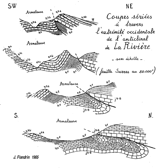 (Serre des Buisses, en bas) par J.Flandrin, (1965) c1 = marnes bleues ; n5-n1 = Crétacé inférieur ; j9-8 = Tithonique. Présentation originelle : les notations sont celles de la carte géologique au 1/50.000° (voir liste des abréviations).