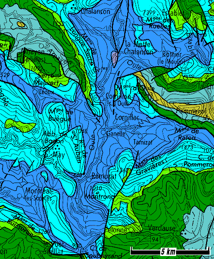 Carte géologique très simplifiée du bassin inférieur et moyen de l'Oule |