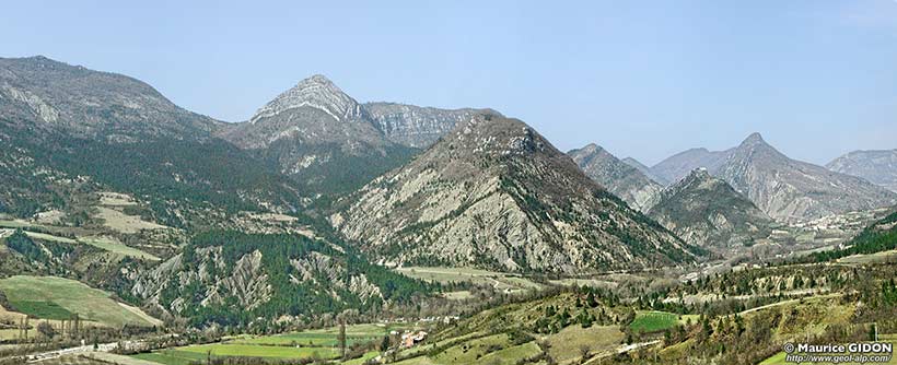 ![]() La vallée de l'Oule, en aval de Cornillon, vue du sud-est depuis les abords du Hameau de La Donne. ØA = chevauchement d'Angèle (extrémité sud) ; a.L = anticlinal de Léoux ; ØP = chevauchement du Pensier (cassure mineure affectant la voûte de l'anticlinal de Léoux) ; a.Ch = anticlinal de Chalancon. Cette coupe naturelle de la vallée, assez oblique aux axes des plis, correspond sensiblement à la coupe 8 de la planche de la page "Gumiane-Arnayon". |