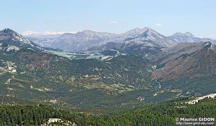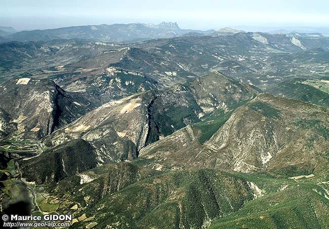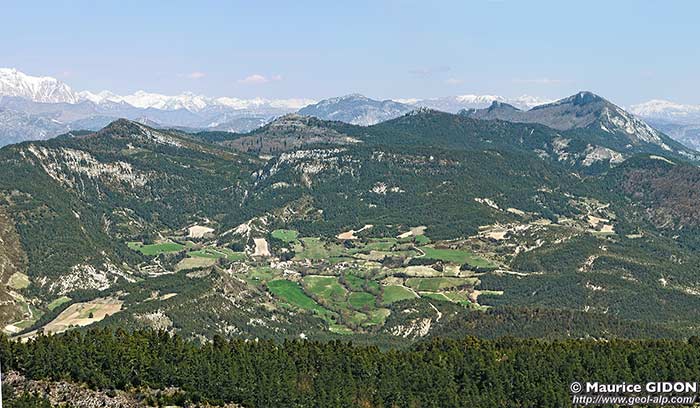 Les environs de Bellegarde en Diois vus de l'est, depuis l'aplomb du col des Pourcieux (au nord-est d'Establet)