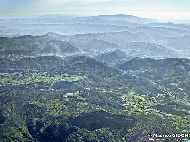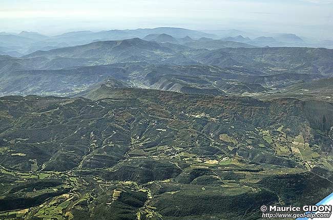 Les confins septentrionaux du bassin hydrographique de l'Oule au niveau d'Establet vus du sud-est, d'avion depuis l'aplomb de Bruis