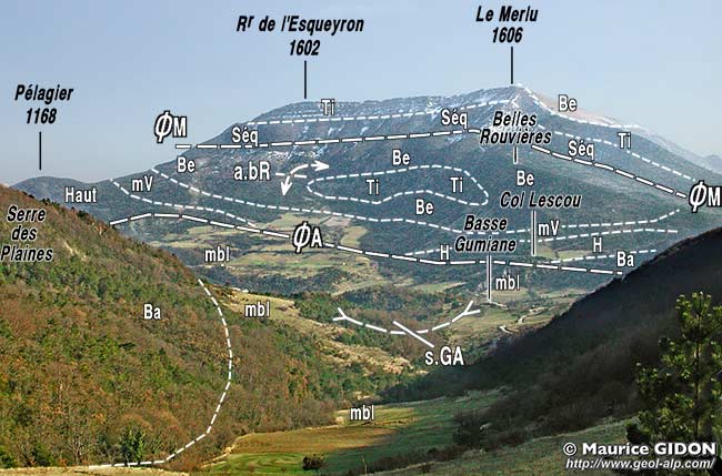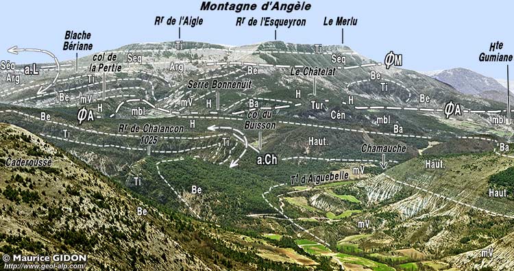 Le versant nord-oriental de la Montagne d'Angèle, que couronne un crêt de Tithonique à regard nord-est, est parcouru par deux accidents chevauchants, tous deux à vergence NE. Celui des hautes pentes, ou chevauchement du Merlu nait du côté est par rupture de la charnière de l'anticlinal de Léoux. L'accident principal est le chevauchement d'Angèle, qui passe plus bas dans le versant et sectionne les couches du flanc nord-oriental de l'anticlinal de Léoux. Cet accident amène, selon les points, les différents termes du Crétacé inférieur en repos sur les marnes bleues du coeur du synclinal de Gumiane-Arnayon, en masquant, le plus souvent, le flanc sud-ouest de ce synclinal : il possède donc une flèche de plusieurs kilomètres.