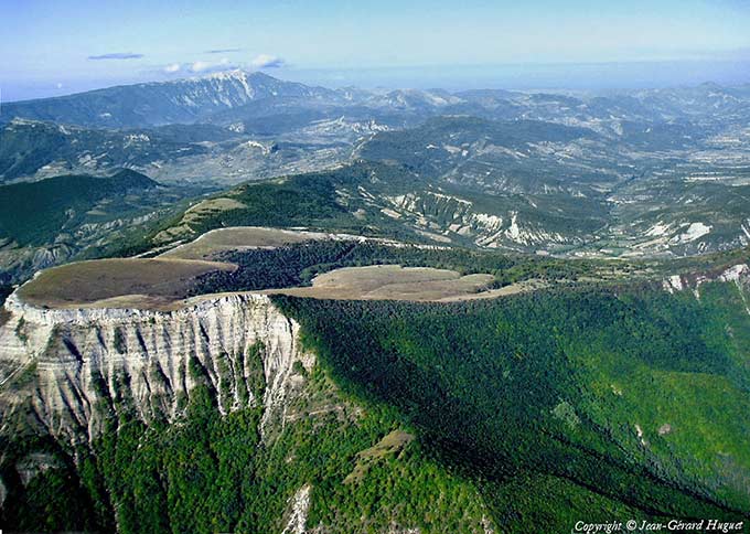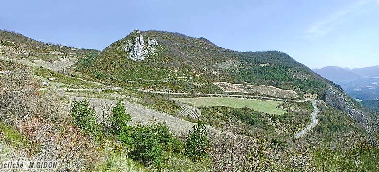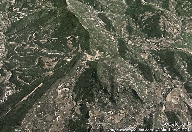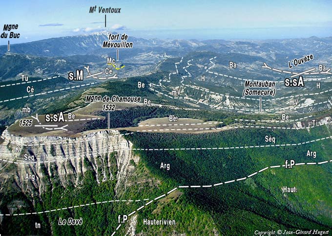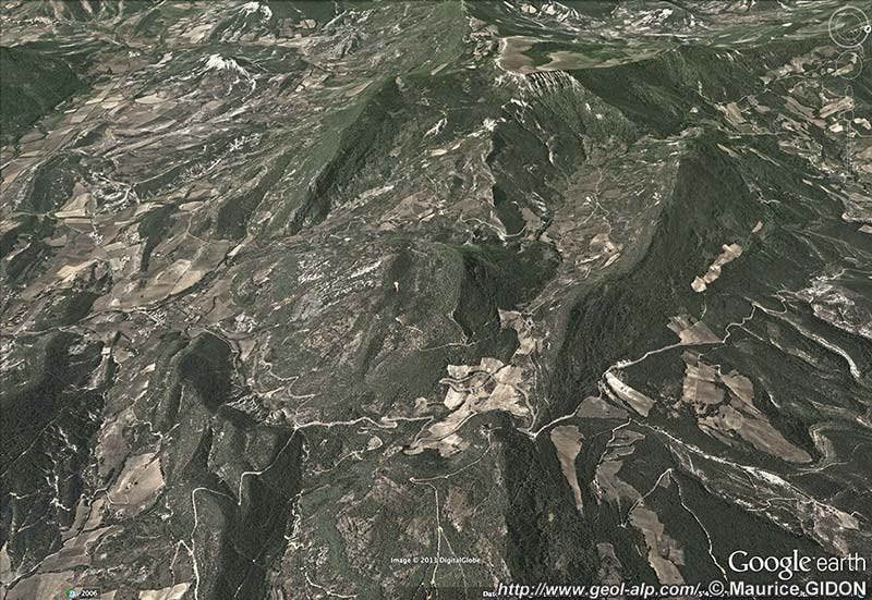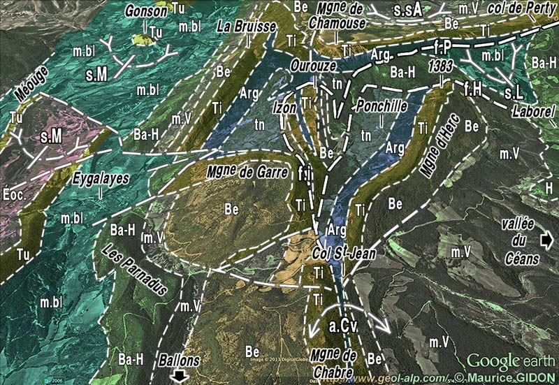 Toutefois la structure n'est pas celle d'un simple brachyanticlinal* à cœur de Terres Noires car, si la dépression est bien ouverte dans ces couches, sa partie centrale est partagée en deux par la butte d'Ourouze, qui est un éperon rocheux allongé E-W formé de Tithonique et de Crétacé inférieur. Ces couches, ployées en un anticlinal d'Ourouze d'axe E-W butent vers l'ouest contre les Terres Noires du sommet de la Montagne de Chamouse, par l'intermédiaire de l'extrémité sud - orientale de la faille du Perty.