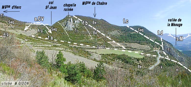 Cette faille du Perty, orientée NW-SE, se raccorde, au nord du col du Perty et de la montagne d'Arsuc, au chevauchement de la Clavelière (voir les pages "Montauban" et "Chauvac"). À l'échelle régionale elle s'avère parallèle à plusieurs décrochements dextres affectant sa lèvre orientale (voir la page "Laborel") et représente sans doute la cassure la plus importante de cette famille, qui semble se conjuguer avec le décrochement sénestre de Sainte-Colombe pour délimiter un coin qui poinçonne* en direction du sud le flanc nord de l'anticlinal de Chabre - Chevallet.