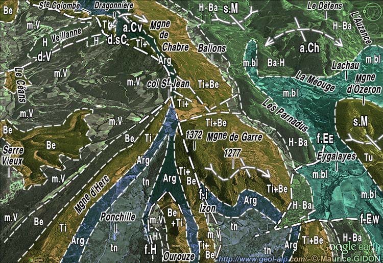 Le flanc méridional de l'anticlinal de Chevalet, constitué par le revers sud du crêt de la montagne de Chabre, se prolonge sans ambiguité au sud du col Saint-Jean par la montagne de Garre et au delà par la crête de La Bruisse. Toutefois il est fragmenté par un système de failles conjuguées à rejet décrochant qui témoignent d'un allongement E-W, notamment à la longitude d'Eygalayes où un poinçon de matériel crétacé s'insinue en direction d'Izon entre les dalles tithoniques de la montagne de Garre et de la crête de La Bruisse.