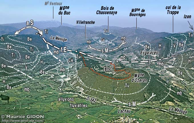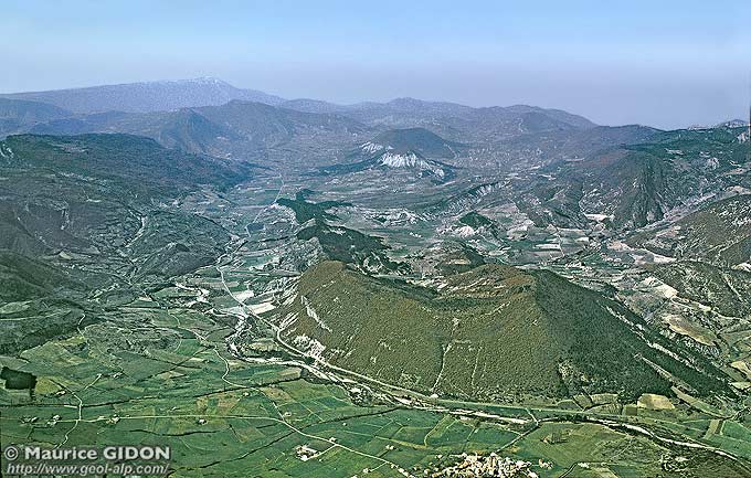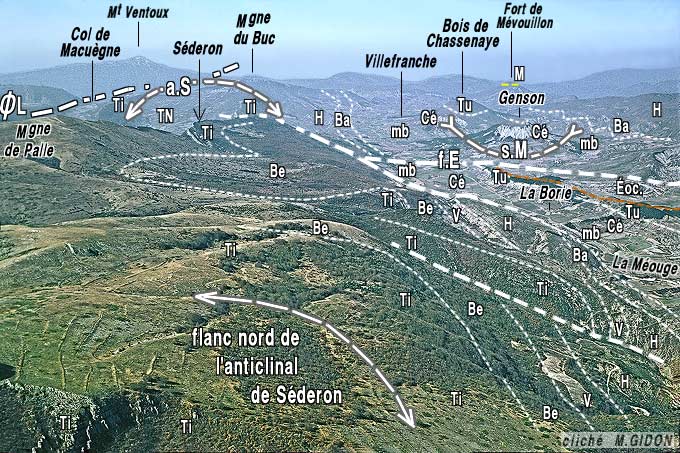 La vallée supérieure de la Méouge, en aval de la petite clue N-S de Séderon, reprend un trajet E-W pour suivre, au flanc sud du très large synclinal de la Méouge, la combe monoclinale des marnes bleues apto-albiennes. Cette combe se poursuit vers l'ouest jusqu'au col de Mévouillon, où elle bute contre la faille transversale de la montagne du Buc.
