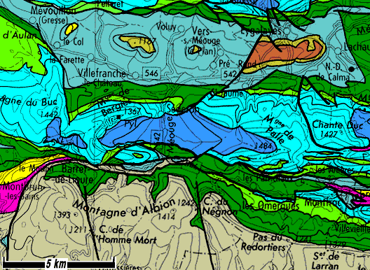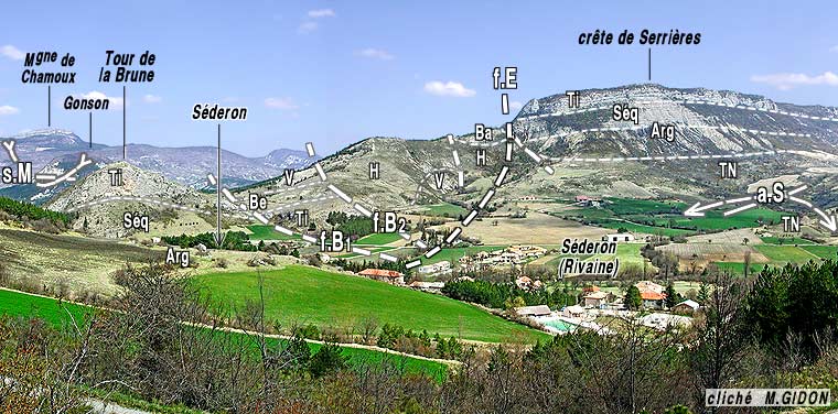 D'autre part le flanc nord de l'anticlinal de Séderon est tranché en oblique par un système de cassures NE-SW, prolongeant grossièrement la faille d'Eygalayes. Elles délimitent un coin, saillant vers le sud-ouest, de terrains crétacés (surtout Hauterivien) qui s'avancent (en perforant la barre tithonique) jusqu'au contact des Terres Noires du flanc nord de l'anticlinal.