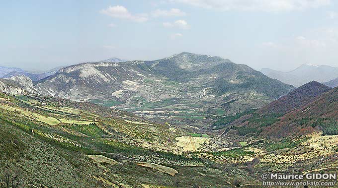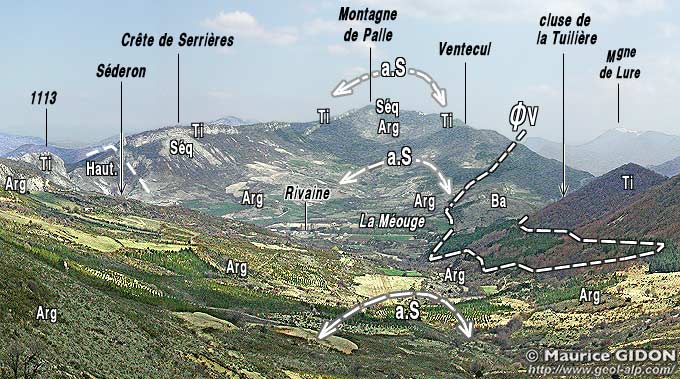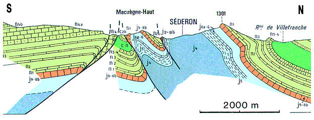 ![]() Coupe N-S, parallèle au cours de la Méouge au niveau de Séderon, passant peu à l'ouest de cette localité (le nord est à droite, contrairement à l'orientation du cliché précédent) extrait de Flandrin, 1963, (présentation retouchée)