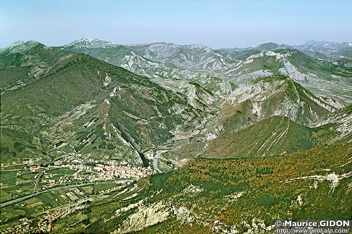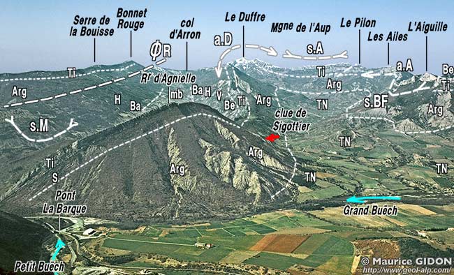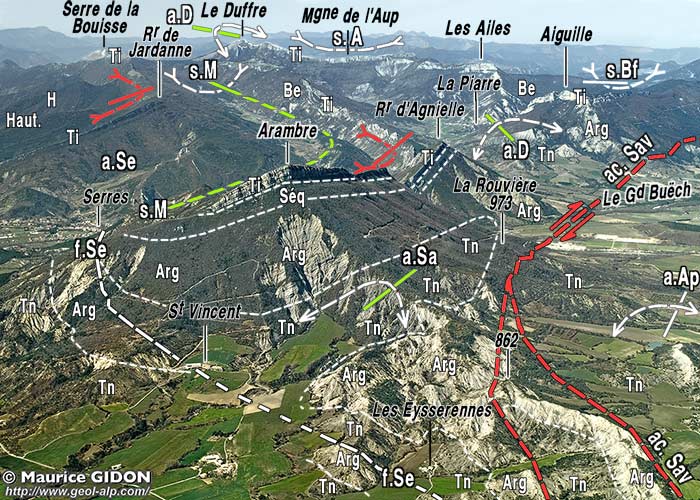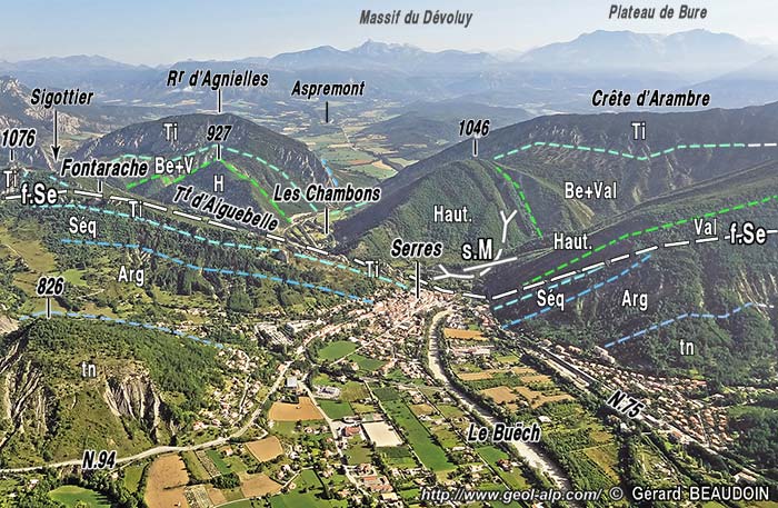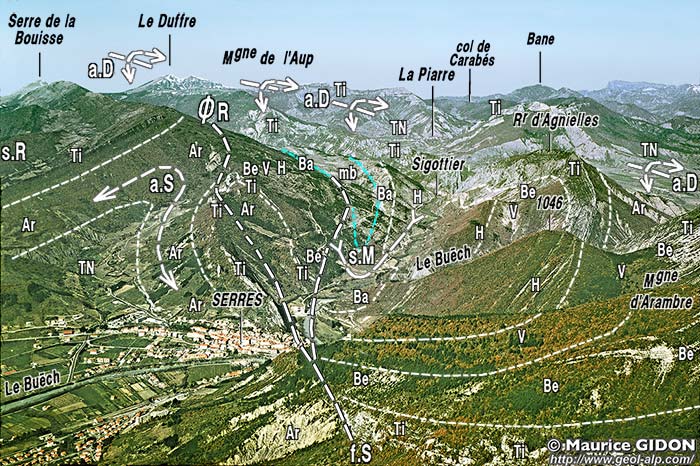 ![]() La cluse de Serres vue d'avion, depuis le sud-est (aplomb du Bersac) s.R = flanc nord du synclinal de Rosans ; ØR = chevauchement de Raton ; a.S = anticlinal de Serres (prolongement oriental de celui des Tourettes) ; s.M = synclinal de Montmorin ; a.D = anticlinal du Duffre ; f.S = faille de Serres . |