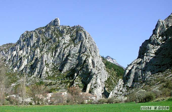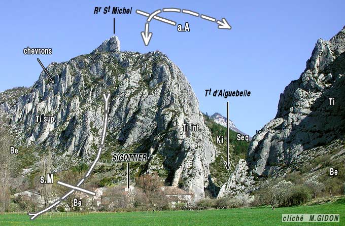 À l'ouest de la cluse amont du Buëch le village de Sigottier est construit au débouché aval de la cluse parallèle qui est pratiqué par son affluent le Torrent d'Aiguebelle. Il s'appuie sur le versant sud de la barre du Tithonique du flanc nord du synclinal de Montmorin, redressée à la verticale. L'érosion a spectaculairement découpé les bancs supérieurs, un peu moins massifs, de ces calcaires en une succession de clochetons qui sont de typiques chevrons de V topographiques*.