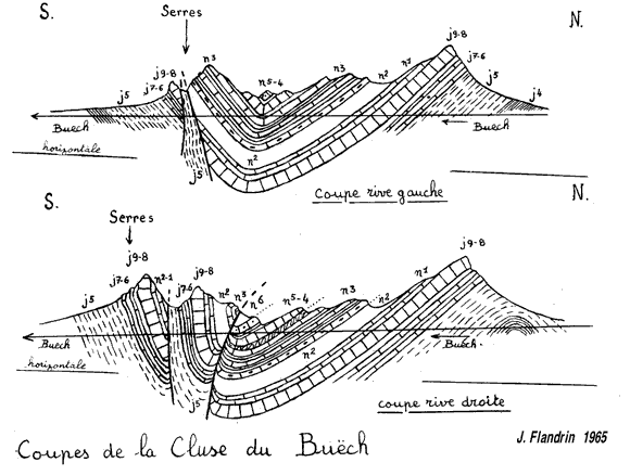![]() Deux coupes de part et d'autre du cours du Buëch à Serres par J.Flandrin, 1963 (présentation retouchée) Les notations sont celles des cartes géologiques (voir liste des abréviations) |