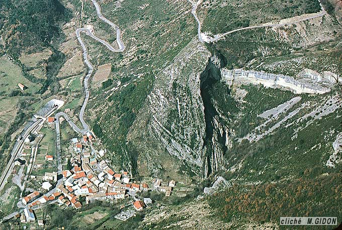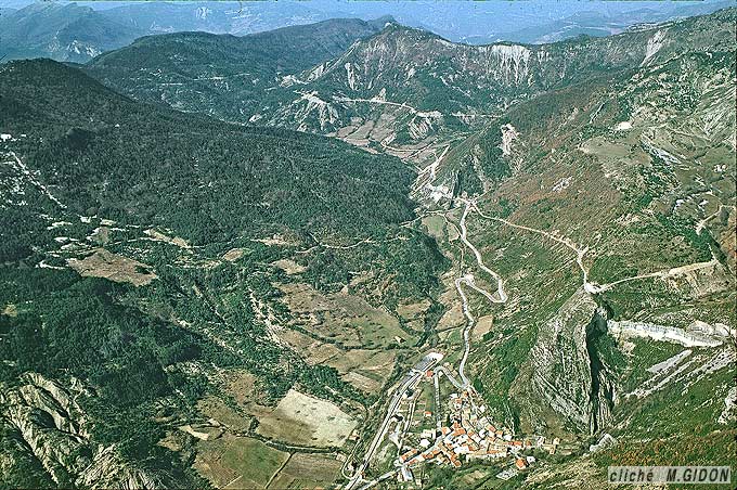 L'entaille du ravin qui débouche montre en premier lieu que la voûte de sa charnière est affectée à ce niveau par un curieux rebroussement en sens inverse du déversement du pli principal ; le redressement à la verticale de cette partie tordue de la charnière est à l'origine du dessin assez remarquable qu'y montre de la barre tithonique au dessus du village.