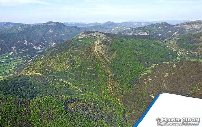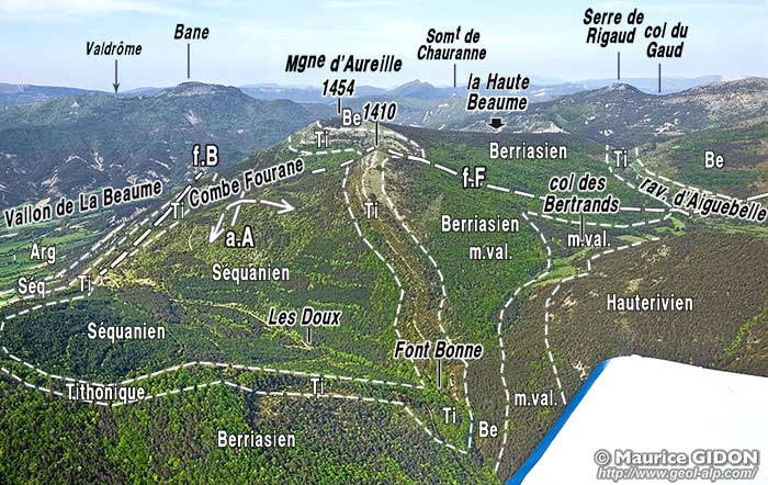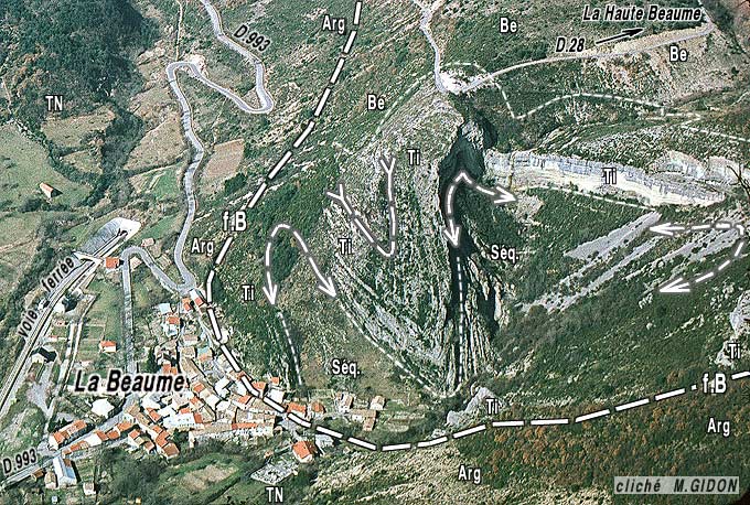 ![]() Le village de la Baume et la gorge du vallon de la Haute Beaume, vus d'avion, depuis l'est f.B = faille de la Beaume Les replis dessinés par la barre tithonique sont clairement analysables sous cet angle. Ils ne peuvent pas être interprétés comme des crochons ni comme des plis d'entraînement liés à la faille de la Beaume (le rejet vertical de celle-ci est un soulèvement de sa lèvre gauche, méridionale). Pourtant la localisation de ces plis, en bordure de la faille, leur taille modeste, qui en fait des accidents visiblement liés à une cause locale, et leur axe sensiblement parallèle à la surface de cassure, tout ceci incite à penser que leur formation est en rapport avec cette faille. En définitive il faut sans doute envisager que la faille soit antérieure aux plis et que ceux-ci résultent d'un froissement contre le plan de faille lors d'une compression tardive (phénomène dit du "plissotement par ancrage sur faille") |
