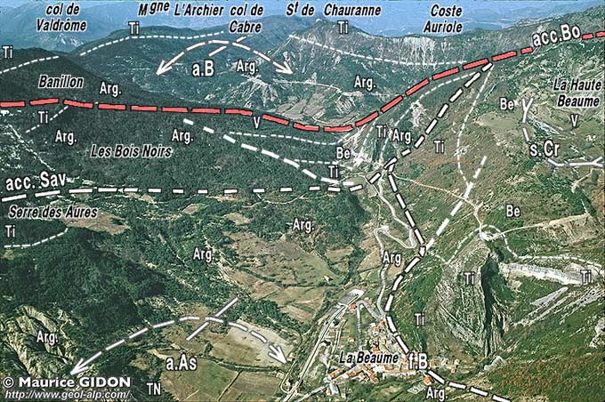Le tracé de la faille de la Beaume tourne de le même manière, en sens horaire, pour devenir SE-NW à l'ouest du village, où la cassure prend le caractère d'un chevauchement redoublant le Tithonique (c'est donc une faille compressive résultant d'un serrage presque N-S).