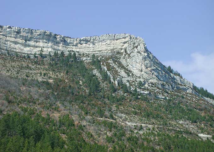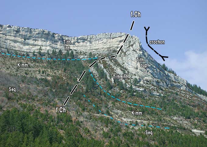 ![]() Le Serre Chauvière vu du sud, depuis la route sylvo-pastorale de Montmaur-en-Diois f.Ch = faille de Chauvière |