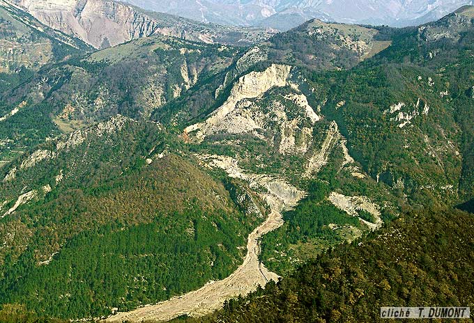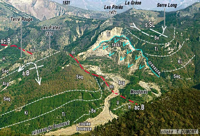 Cet effondrement du versant ouest du Serre Long est indirectement dû à la présence de l'accident de Bonneval. En effet il a été déclenché par l'érosion torrentielle du ravin qui descend du col séparant les sommets des Plates et des Piniés, dont l'approfondissement progressif a fini par saper le pied du versant. Or le tracé de ce ravin a été guidé par la bande de Molasse Rouge oligocène et de marnes argoviennes qui jalonne l'accident de Bonneval. Faute de la présence de cette bande de terrains tendres l'érosion aurait agi selon la ligne de plus grande pente, le long du ravin du col du Tat, au lieu de suivre le pied des abrupts des Piniés.