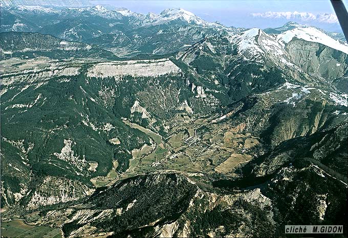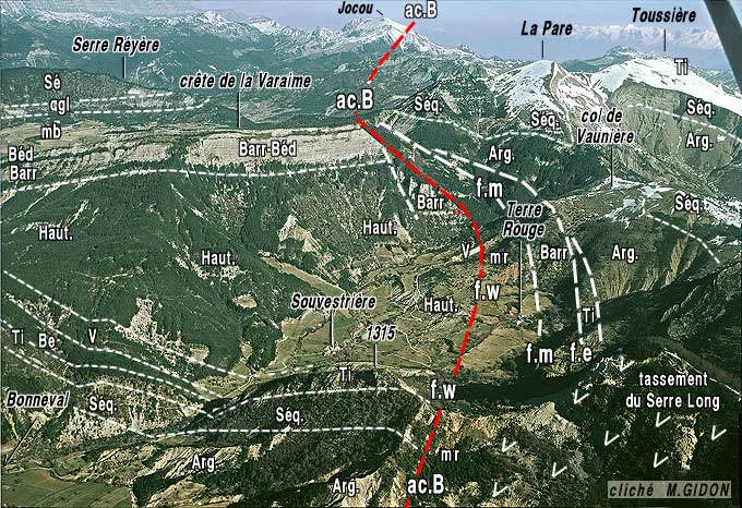 À l'ouest de l'accident de Bonneval le relief est gouverné par une succession de plis similaires, mais avec lesquels on ne sait pas reconnaître les correspondances qui existaient originellement de part et d'autre de la cassure. En particulier le chef lieu de Bonneval-en-Diois est construit sur l'Argovien du coeur d'un anticlinal de Bonneval, orienté NW-SE, dans une petite cluse* créée par le torrent qui descend de Souvestrière et de Terre Rouge. En aval du confluent de ce torrent avec le ruisseau de Bonneval (à Ville Basse) ce dernier cours d'eau emprunte une combe monoclinale au flanc sud-ouest du pli ; mais celle-ci est inscrite, de façon un peu inhabituelle, dans les niveaux à lits marneux du Kimméridgien et non dans les niveaux du Berriasien-Valanginien, comme cela est plus ordinaire.