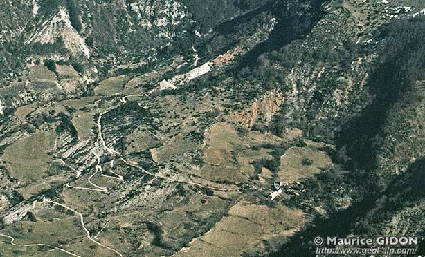(agrandissement de la vue précédente, permettant de mieux discerner les affleurements de Molasse Rouge) |