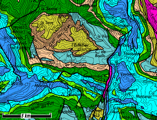 La localité de Boulc commande une large combe monoclinale* ouverte dans les marnes bleues apto-albiennes, qui s'élève jusqu' au col de Boulc mais s'interrompt là brutalement, en butant contre les terrains jurassiques des escarpenents de Toussière. Ceci est dû à ce que les plis E-W sont tranchés là par une grande cassure N-S, l'accident de Bonneval. Le village lui-même est adossé, en rive droite du torrent de Bonneval, à la barre de calcaires bioclastiques* bédouliens du flanc nord de l'anticlinal E-W de Bonneval. Elle s'élève, plus à l'est, en formant la crête de la montagne de Varaime, qui est coupée à son tour par l'accident de Bonneval au col de Varaime. L'autre flanc de la combe de Boulc, constitué par la montagne de l'Estellier, est sculptée dans les épaisses couches de calcaires sénoniens du coeur du synclinal de Glandage.