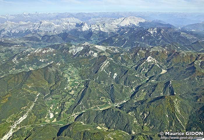 De fait on observe dans la partie nord-ouest de l'actuel synclinal de Glandage (entre le Serre et Reychas) que le Sénonien repose directement, sans conglomérats, et en onlap* sur le Barrémo -Bédoulien. Comme on est là sur le flanc sud-ouest de l'anticlinal de Grimone cela signifie que la voûte ce pli E-W, anté-Sénonien, avait déjà été érodée dès cette époque. Or cette érosion alimentait (pour partie) l'épandage des conglomérats des Gâts, au sein des sédiments qui continuaient pendant ce temps à s'accumuler, plus au sud, bien en dessous de la surface de la mer. Il faut donc en conclure que la discordance qui témoigne des plissements anté-Sénoniens est due à une érosion sous-marine et non le résultat d'une émersion de reliefs à l'air libre.