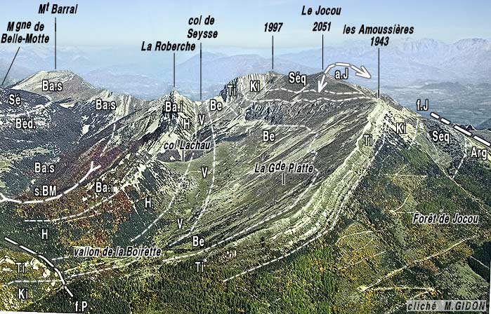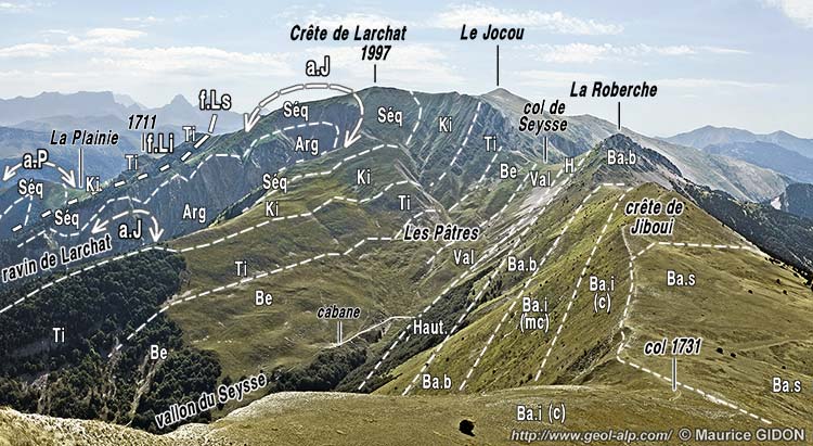 Du fait de l'obliquité globale de cette entaille c'est en décrivant un tracé en baïonnette que la crête de la montagne (qui devient ici la ligne de partage des eaux entre Isère et Drôme) se poursuit au nord du sommet du Jocou, en direction du Mont Barral : ce dessin correspond au fait qu'elle est formée de tronçons successifs correspondant aux niveaux plus résistants que l'érosion a rencontré en coupant en oblique la succession stratigraphique du flanc ouest de l'anticlinal : calcaires tithoniques jusqu'à l'aplomb du col du Seysse, calcaires bioclastiques du Barrémien basal à la crête de la Roberche, enfin calcaires plus ou moins massifs du Barrémien inférieur sur la crête de Jiboui.