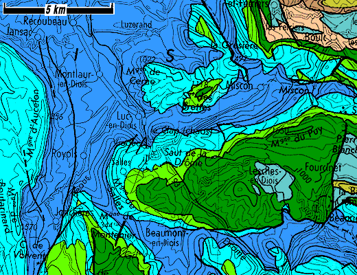 Les plis E-W les plus importants sont le synclinal des Brettes et l'anticlinal de Miscon.