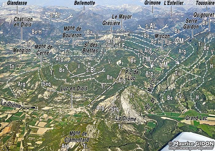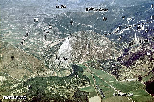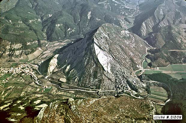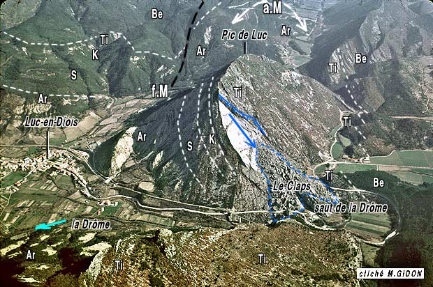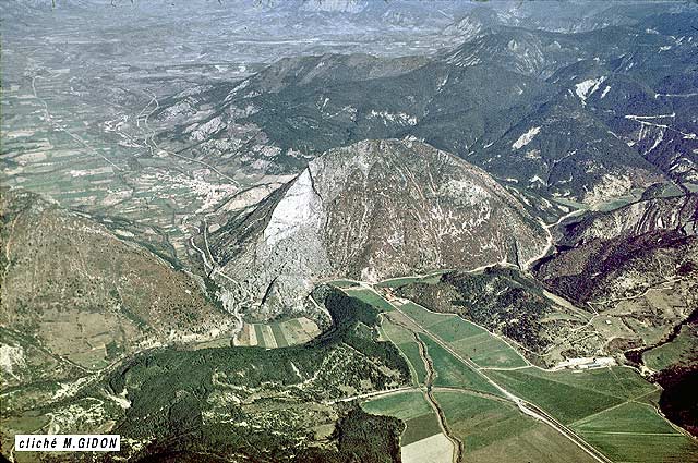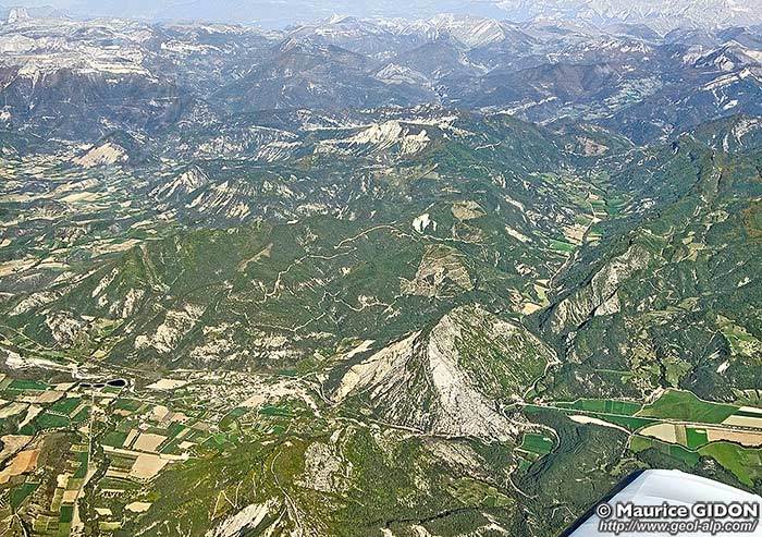 ![]() La vallée de la Drôme à Luc-en-Diois vue du sud (d'amont), d'avion a.M = anticlinal de Miscon |