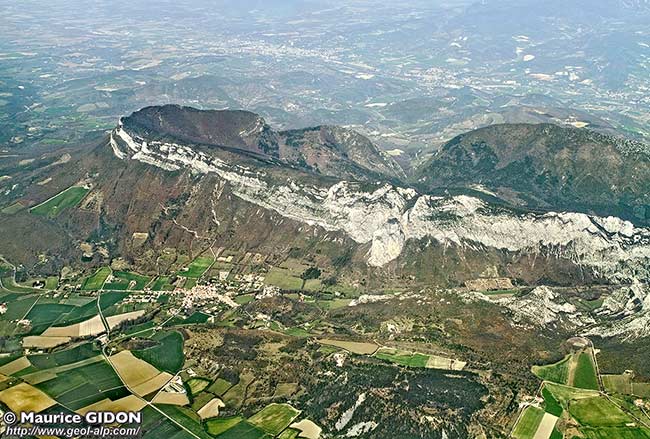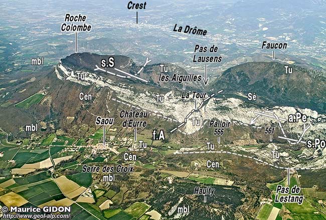 La montagne de la Forêt de Saou, qui culmine du côté oriental avec les sommets des Trois Becs, s'avance en un promontoire bien détaché vers les plaines du Valentinois. Elle abrite un val presque rectiligne qui correspond au coeur d'un typique synclinal perché*. L'axe de ce dernier, orienté WNW-ESE, marque un ensellement au niveau de la localité de Saou : à l'est il plonge doucement vers l'ouest, tandis qu'à l'ouest, à Roche Colombe, il se relève au contraire dans cette direction.
