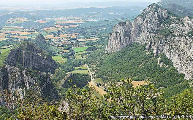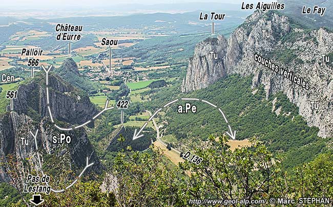Au nord-est de Saou la barre des calcaires du flanc sud du pli est tranchée en biais, au lieu-dit Le Pertuis, par le torrent de la Vèbre, qui s'échappe ainsi du val pour rejoindre le village de Saou (cet itinéraire est suivi par la route D.136 pour accéder à l'intérieur de la forêt de Saou). Mais les calcaires turoniens forment encore, en rive gauche du torrent, l'éperon rocheux du Petit Pomerolle et de Pallois, qui porte à son extrémité occidentale le Château d'Eurre.