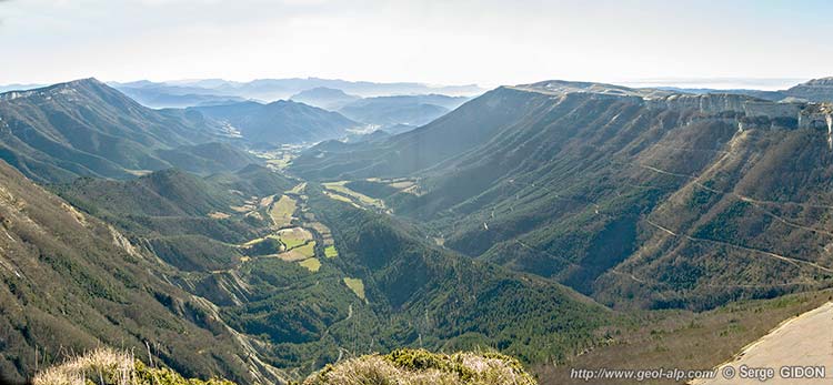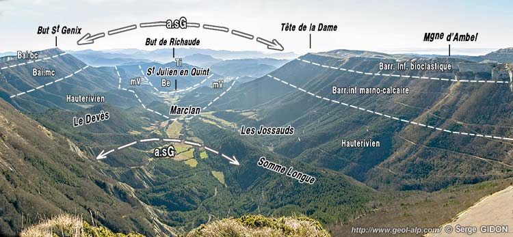 Le rentrant vers le nord que dessine là la marge septentrionale de la dépression de Die découle évidemment pour bonne part du plongement axial vers le nord de ces trois plis qui a évidemment eu pour effet que la carapace "urgonienne" de la voûte de ces plis a été plus exposée, vers le sud, à l'arasement du quaternaire ancien. Mais cet arasement a également été facilité par la disparition progressive, vers le sud, des faciès calcaires massifs du Barrémien : ces derniers ne forment plus là que des passées disjointes qui s'effilent au sein des faciès marno-calcaires de même âge.