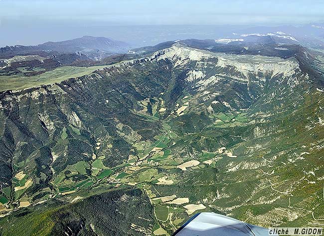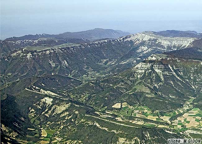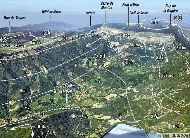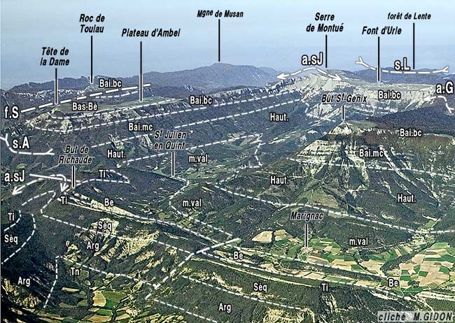 même fenêtre Les pentes sud-orientales de Font d'Urle et le rebord méridional du Vercors, vus du sud-est, d'avion. f.S = faille de Saillans ; s.A = synclinal d'Ambel ; a.sJ = anticlinal de Saint-Julien (le coeur de ce pli forme un typique mont* dérivé* qui culmine au Serre de Richaud) ; s.L = synclinal de Lente ; a.G = anticlinal de la Gagère ; s.V = synclinal de Vassieux. Ce cliché illustre bien par quel processus (qui n'est que celui du plissement concentrique*) on passe ici d'un anticlinal étroit au niveau du Tithonique à un pli coffré au niveau de l'Urgonien (voir texte et schéma à l'article "pli coffré" du glossaire tectonique) . |