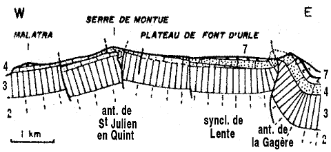 charnière anticlinale orientale, du Puy de la Gagère, ce qui délimite une large ondulation synclinale de Lente. En définitive l'ensemble de ces