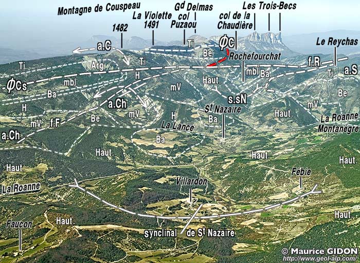 Cette disposition est évidemment en relation avec le fait que le synclinal se termine au nord-ouest de Rochefourchat en se faisant trancher en biseau par la faille de Rochefourchat (elle témoigne d'ailleurs du rejet dextre de cette dernière). Cette cassure N-S prolonge à cette latitude le faisceau des failles de Saillans.