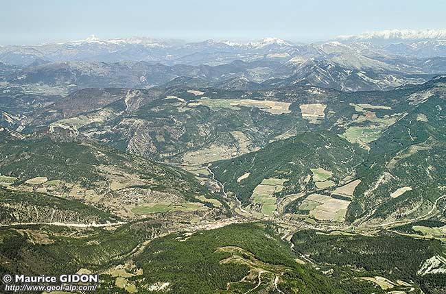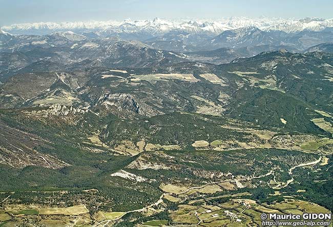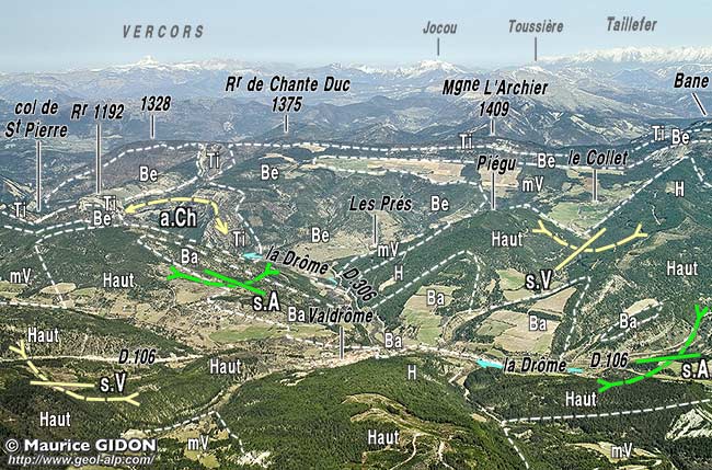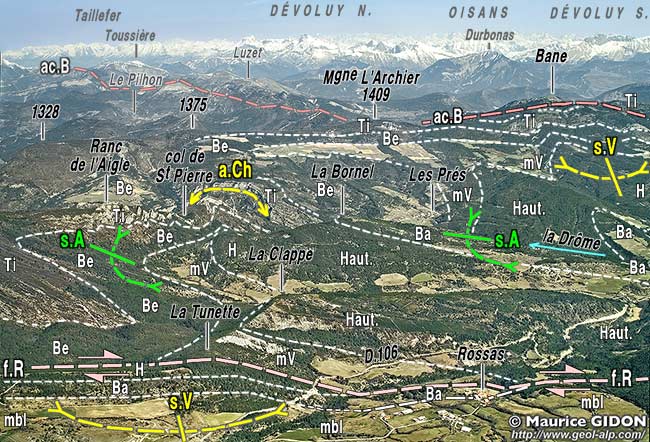 La manière dont ces plis s'effacent vers l'est illustre bien le phénomène du "dépliage" des plis anté-sénoniens, anciens (E-W), lors du jeu des accidents post-sénoniens (voir à ce sujet la page sur la tectonique du Diois).