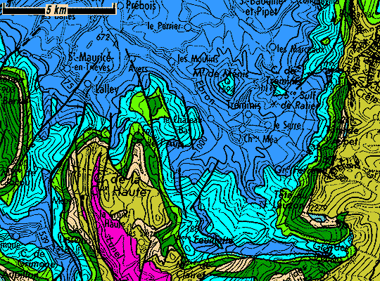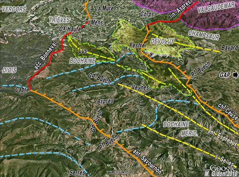 Un autre trait structural, peu visible mais important, est constitué par le fait que cette dépression est traversée en diagonale par une grande cassure qui court du NE au SW depuis le Grand Oriol (voir la page "Mens") jusqu'à Lalley et aux abords ouest du col de Lus. Elle connecte les deux accident majeurs que sont le chevauchement du Sénépy, au nord, et l'accident de Bonneval, au sud.