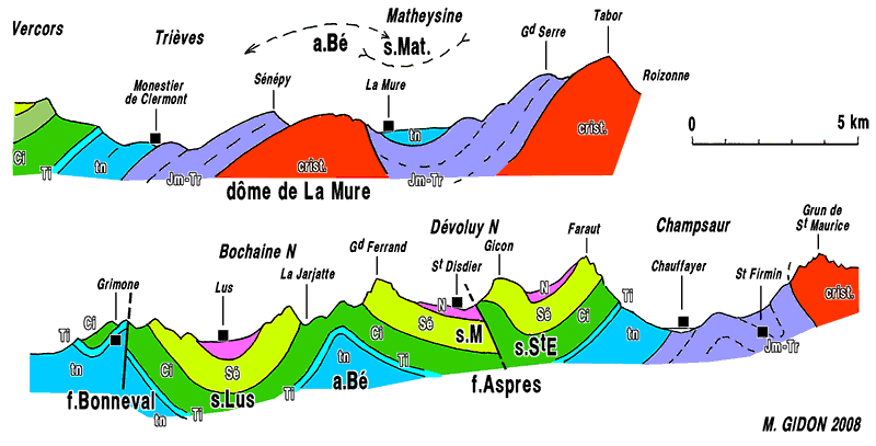Rapports structuraux entre la transversale de la Matheysine et celle du Bochaine septentrional : Le Dôme de la Mure se prolonge par l'anticlinal de la Béoux (a.Bé) et le synclinal de la Matheysine (s.M) par le grand synclinal de Saint-Étienne (s.StE) qui concerne en fait tout le Dévoluy intérieur, mais que la faille d'Aspres traverse en oblique. |