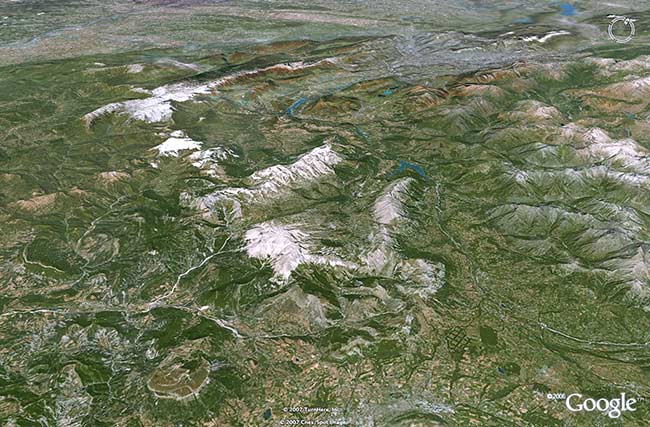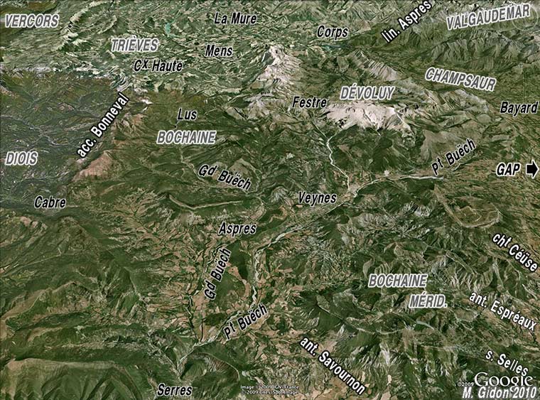 Rapports entre le Diois, le Bochaine, le Dévoluy et le bassin du Drac (au nord) (d'après une image Google-earth)