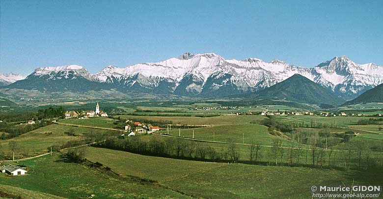 ![]() La partie méridionale du Trièves, vue de l'ouest depuis la route N.75, 5 km au sud de Clelles (hameau des Blancs) : à gauche le village du Percy, à droite celui du Monêtier du Percy. vue d'enfilade de la surface du plateau alluvial, recouvrant les Terres Noires, qui s'étend jusqu'au pied du cône du Ménil (à droite). et jusqu'à Mens, au pied du Châtel, à gauche ; en arrière-plan l'extrémité septentrionale du Dévoluy (chaînon de l'Obiou). |