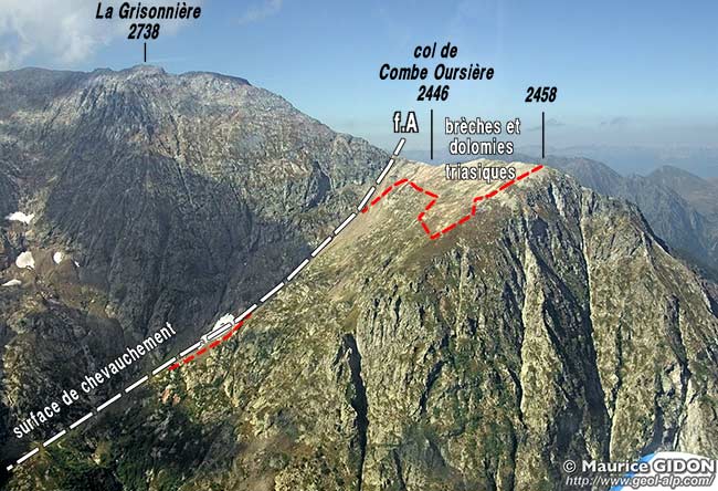 ![]() Vue rapprochée de la Combe Oursière, du nord-est, d'avion Les tirets rouges délimitent la portion conservée de surface de la pénéplaine anté-triasique, sur laquelle sont encroutés des placages de dolomie triasique (les affleurements les plus importants sont situés sur le revers opposé de la crête du col). |