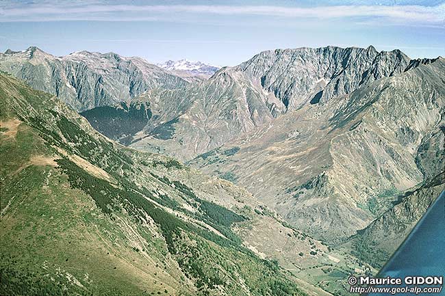 ![]() La rive ouest de la vallée de la Malsanne : vue d'ensemble, du nord-est, depuis les pentes du Grand Renaud (suite vers le nord, au cliché suivant). f.cO = faille du col d'Ornon. Les numéros 1a, 1b et 2a se réfèrent à ceux de la carte de la page "Chantelouve" et désignent les amas d'olistolites. La dénivellation entre le Trias des crêtes de l'Armet (en rouge) et le fond de vallée est de 1600 m. |