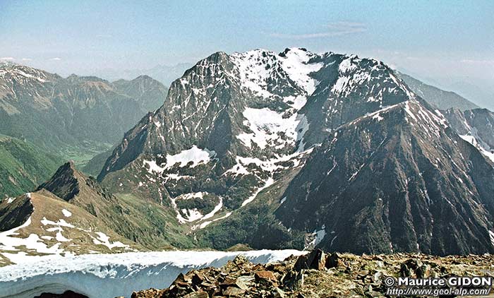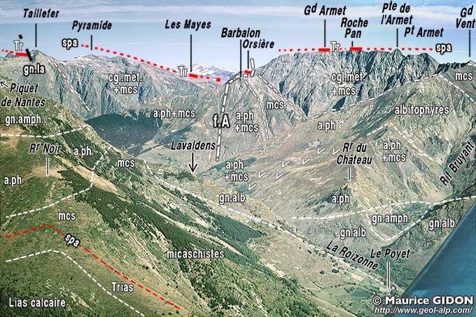 ![]() La vallée de Chantelouve et la rive nord du ravin de la Chave (pentes du Grand Renaud) vues de l'est, depuis les pentes en contrebas ouest du Pic du col d'Ornon (suite vers le nord, du cliché précédent). La faille de l'Armet (f.A) est vue pratiquement d'enfilade, ce qui permet de constater que sa surface de cassure est très fortement pentée vers le sud. On voit en outre qu'elle décale la faille du col d' Ornon (f.cO, en rose) dans le sens sénestre (le compartiment nord, de Plancol, est décalé vers l'arrière par rapport au compartiment sud, de l'Armet). Ces deux faits portent à penser que cette cassure a dû jouer en décrochement, en plus de son jeu chevauchant dont atteste le décalage vertical de la surface de la pénéplaine anté-triasique (en rouge). En premier plan le ravin de la Chave traverse un chevauchement mineur (f.C), à vergence nord et à pendage "normalement" peu incliné, qui détermine un crochon bien visible. On a indiqué par "olist." les affleurements d'olistolites de la Chalp à gauche et des Grandes côtes, à droite (voir les pages "Chantelouve" et "col d'Ornon"). |