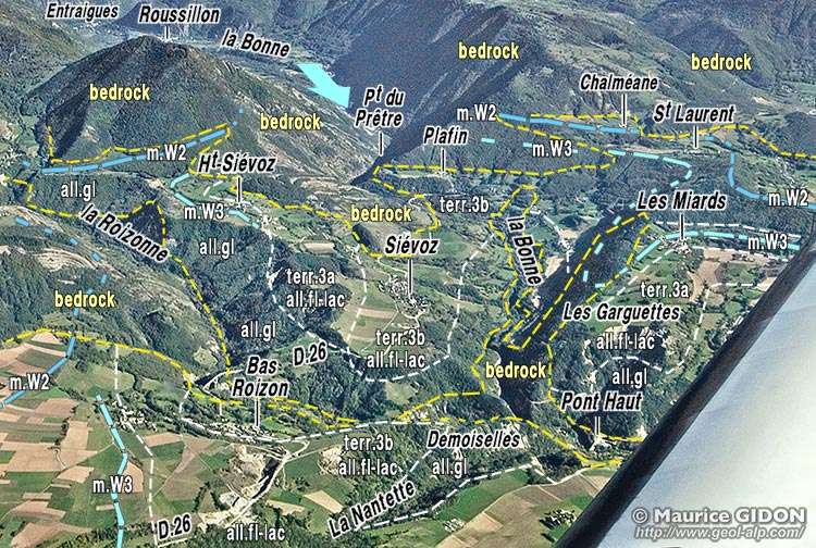 Les environs du confluent Drac-Bonne, vus du sud depuis le sommet du Châtel. Les tirets jaunes limitent le secteur où le bedrock est masqué sous le quaternaire. cgl base = conglomérats fluviatiles de base (Würm I) ; m.W2 : crête de moraine du Würm II ; all,gl. = alluvions glaciaires de fond ; all.fl-lac. = alluvions fluvio-lacustres (constituant essentiel de la terrasse de Pellafol) ; m.W3 : moraine du Würm III ; |