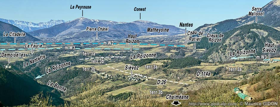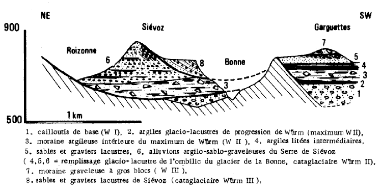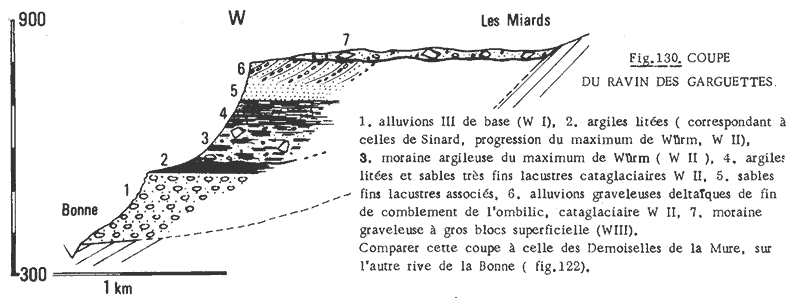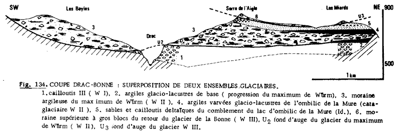 On y voit en particulier que c'est dans des alluvions glaciaires argileuses que sont sculptées les Demoiselles coiffées que l'on voit (notamment) depuis les tournants de la N.85 aux alentours du Pont Haut : il s'agit d'un garnissage morainique de fond qui a tapissé l'ombilic creusé par le glacier du Würm II. Les argiles qui les recouvrent correspondent à son colmatage lacustre, lequel devient plus sableux et caillouteux vers le haut. Elles supportent à leur tour les produits amenés par la récurrence du glacier Würm III, savoir la moraine du maximum d'avancée et les terrasses fluviatiles emboitées du comblement de la dépression libérée lors de son retrait.