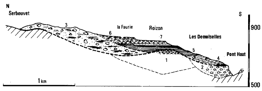 4 et 3 = alluvions glaciaires (maximum du Würm II)
