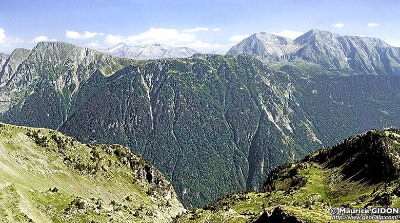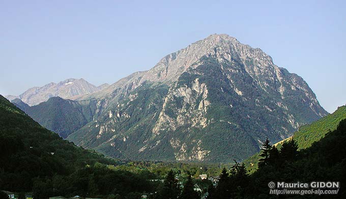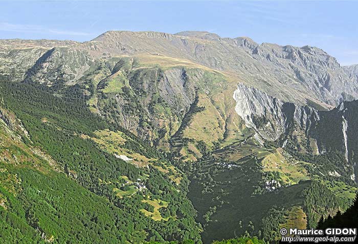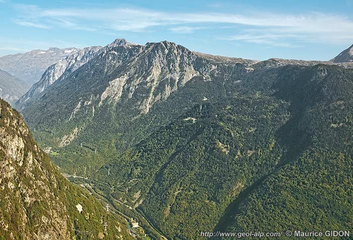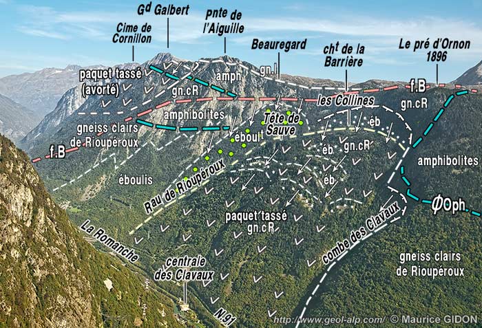 À l'ouest de la faille de la Barrière les pentes qui s'élèvent depuis le lit de la Romanche jusqu'au rebord du plateau du Poursollet sont formées uniquement par les orthogneiss clairs du complexe volcano-plutonique de Rioupéroux
