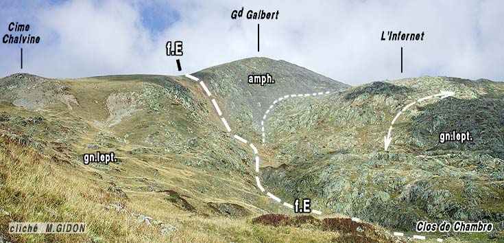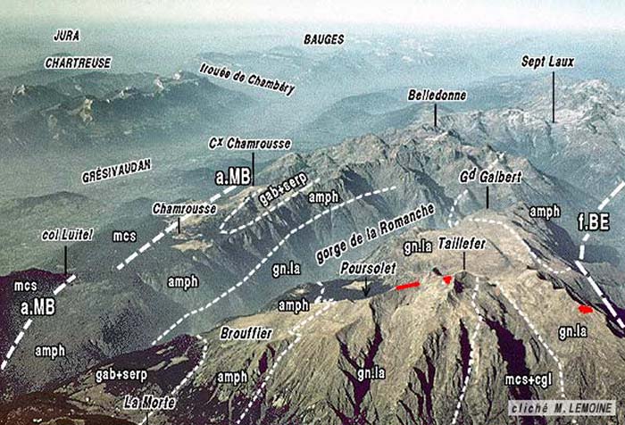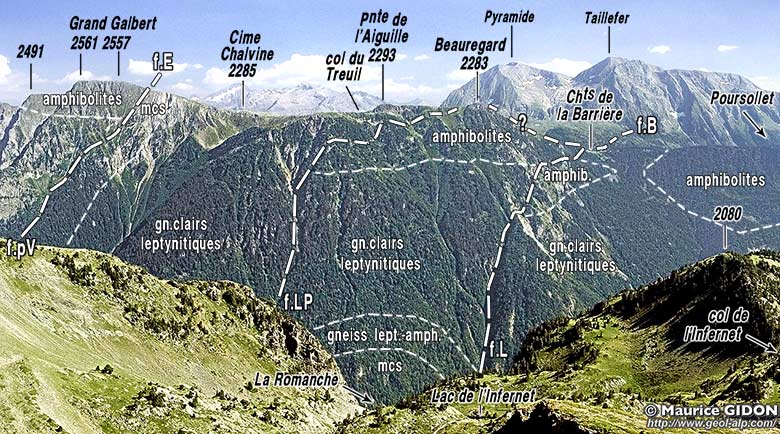 Le sommet du Grand Galbert (2561) est constitué par un chapeau isolé d'amphibolites, sans doute à rattacher à la nappe ophiolitique de Chamrousse comme celui de la Cime de Beauregard. Il couronne les abrupts de la partie amont de la rive gauche de la gorge de la Romanche. Ces abrupts, symétriques de ceux du revers sud-oriental de la crête de Belledonne, montrent le même système de failles mais il y est plus difficile à voir, en raison de l'important couvert forestier. Mais dès que l'on débouche sur le plateau qui s'étend au revers sud-est de la Cime Chalvine et qui porte les lacs du pied septentrional du Taillefer on y retrouve des failles dont les tracés poursuivent de façon assez évidente ceux de la Petite Vaudaine et des Lessines.