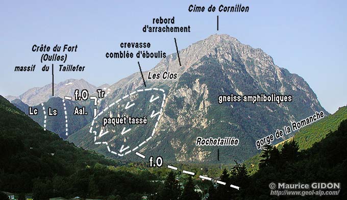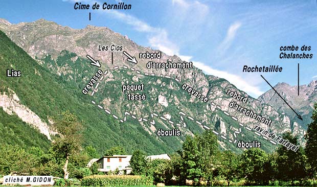 Cela vient de ce que le tracé de la faille, qui devait s'élever dans ce versant, en diagonale vers le sud en direction du village d'Oulles, est masqué par l'important et spectaculaire amas d'énormes panneaux de matériel cristallin des Rochers des Clos . Il s'agit d'un énorme paquet tassé* dont certains éléments sont découpés en clochetons car ils ont été disjoints lors de leur glissement. Le replat des Clos lui-même (au pied de la cime de Cornillon) et la combe de Farfayet représentent la crevasse, en grande partie colmatée d'éboulis, selon laquelle ce paquet rocheux s'est détaché.
